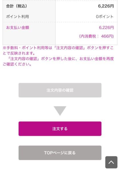 最終的に注文内容の確認が完了しまして、最後に注文するを押すと注文完了となります。