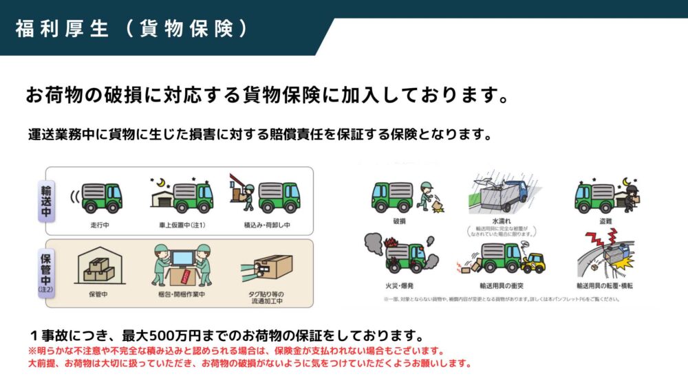 貨物保険では、最大500万円分までお荷物の保証をさせていただいているので、配送していたお荷物が破損してしまっても保険でカバーさせていただきます!