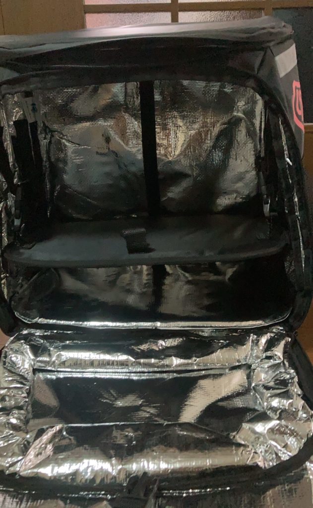 バックはこのような形になっていますが、この設計ですごく軽いんです!Uber Eatsのバックの2/3ぐらいの重さだと思います。