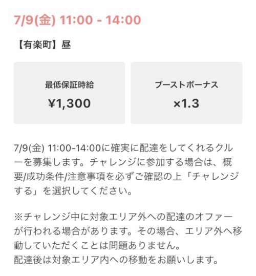 チャレンジとは、様々な時間帯にあわせて、チャレンジタイムが設定されており、下記の条件を満たすと、時給保証やブーストUPの特別条件が付与されるシステムのことを指します!