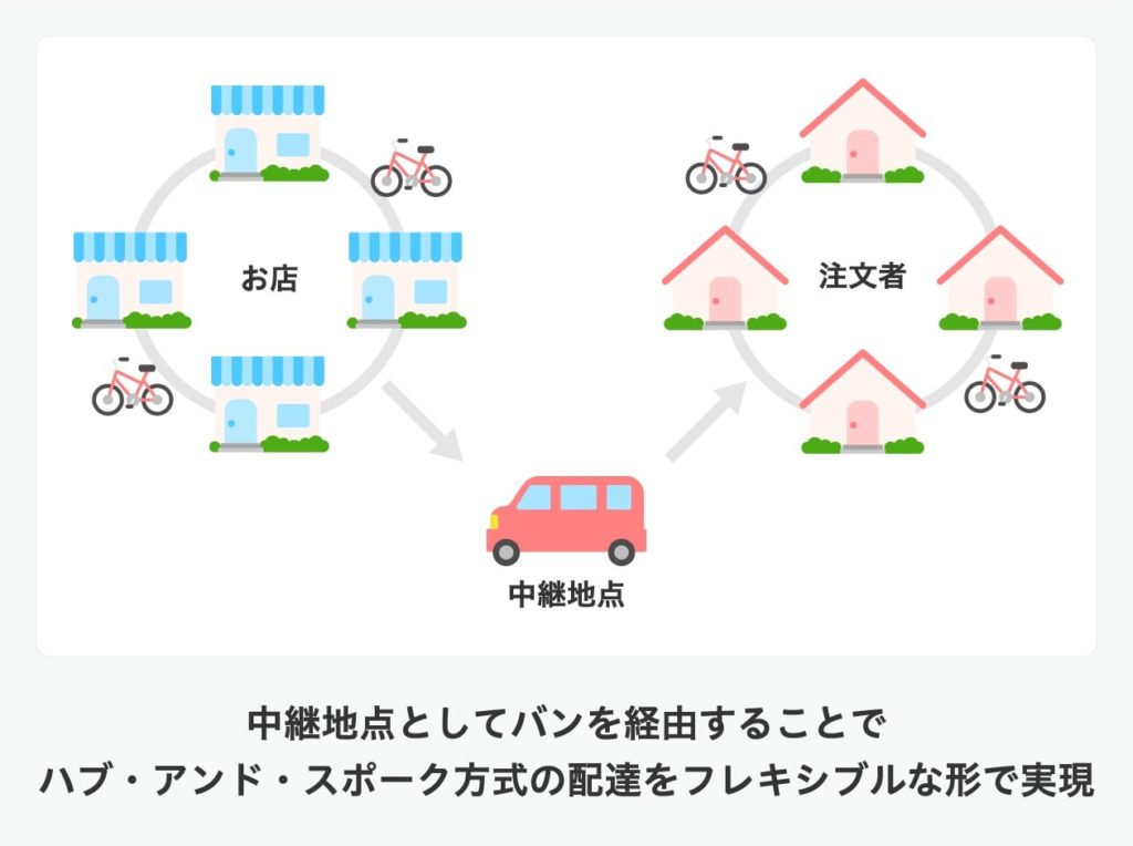 ①お店から中継所に届ける役の配達員さんが、まず複数のお店より、複数のお客様の注文を、いくつも受け取ります(通常配達より、複数回る分、時間がかかります)