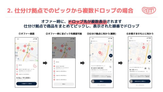 ①複数店舗にピックをして、仕分け地点(デポ)に向かう配達オファー