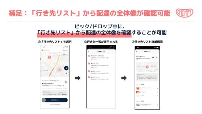 どちらにも共通して、配達の全体像を行先リストより確認することが可能です。