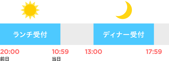 ※ランチ(前日20:00〜当日10:59)、ディナー(13:00〜17:59)