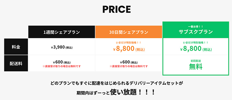 デリバリーアイテムシェアには3つの料金プランが用意されています。