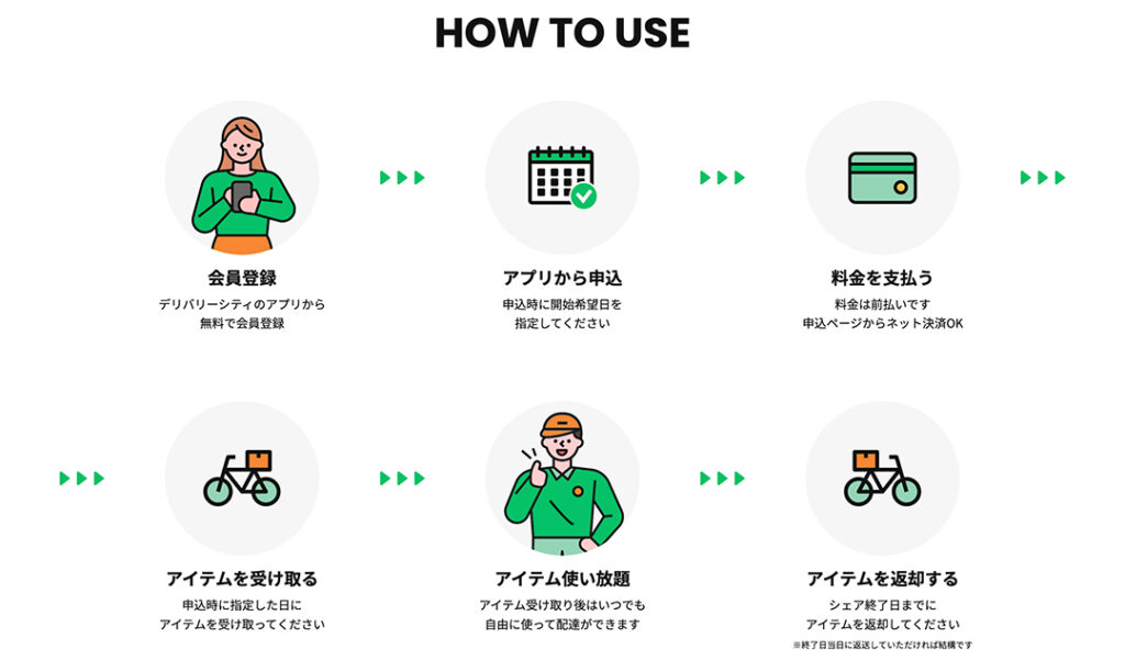 レンタルを利用するためには、エニキャリが運営する配達員向け情報発信サービス「デリバリーシティ」への会員登録が必要となっています。