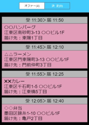 出前館配達員は自動で注文が振り分けられるわけではなく、リストから自分で案件を選択して配達を行うという仕組みになっています。