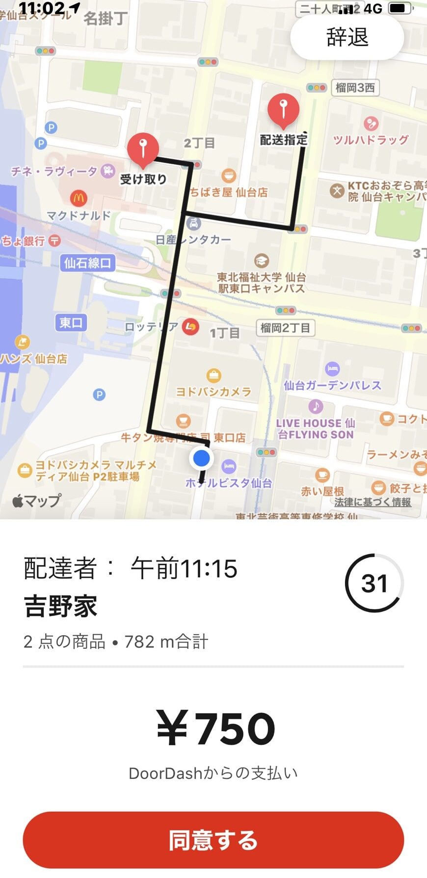 注文の内容を確認して、「同意する」をタップすることで注文を受けることができます。
