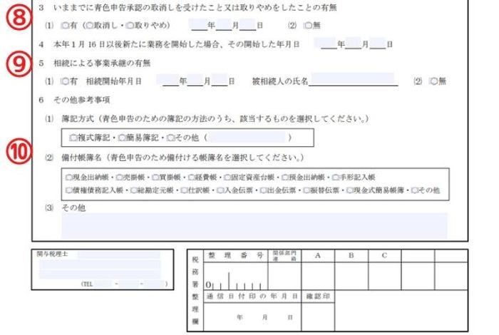 ⑧:青色申告承認の取消しを受けたこと又はとりやめをしたことの有無