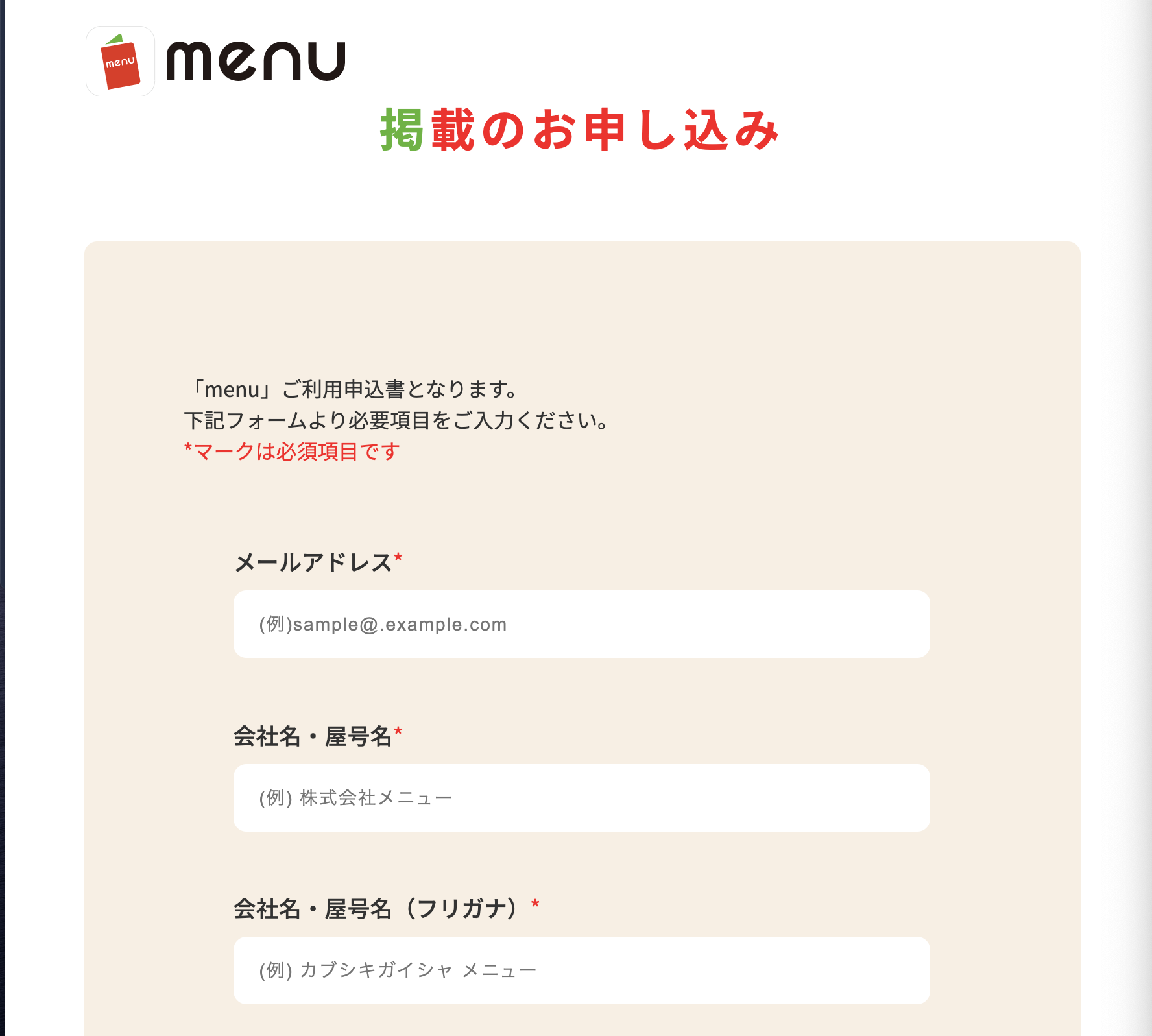 menuの加盟店登録ページでから掲載申し込みフォームに、必要事項の入力を行います。