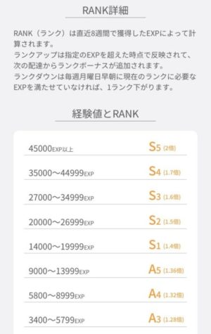 ランクの横に書いてある倍数が、基本報酬にかけられる倍数になっており、最高ランクの【S5ランク】は、基本報酬に常時1.7倍のボーナスがつく制度となっております。