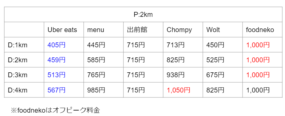 それでは、全てのサービスの配達料金を比較していきたいと思います。