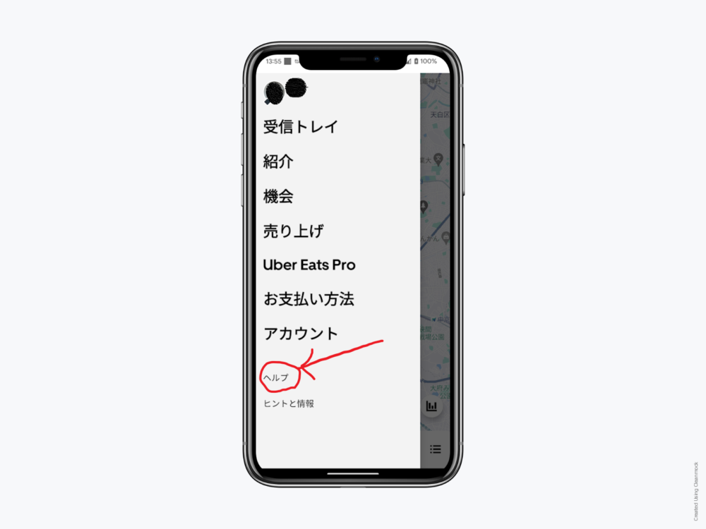 Uber Eats(ウーバーイーツ)への問い合わせは下記の画像のように画面下のヘルプから行います。