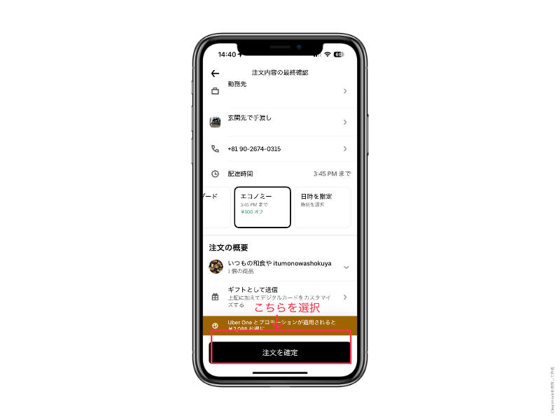 下記画像は平日の12時ごろ、渋谷区で注文した時「エコノミー」配達を選択して100円引きになった注文画面です!
